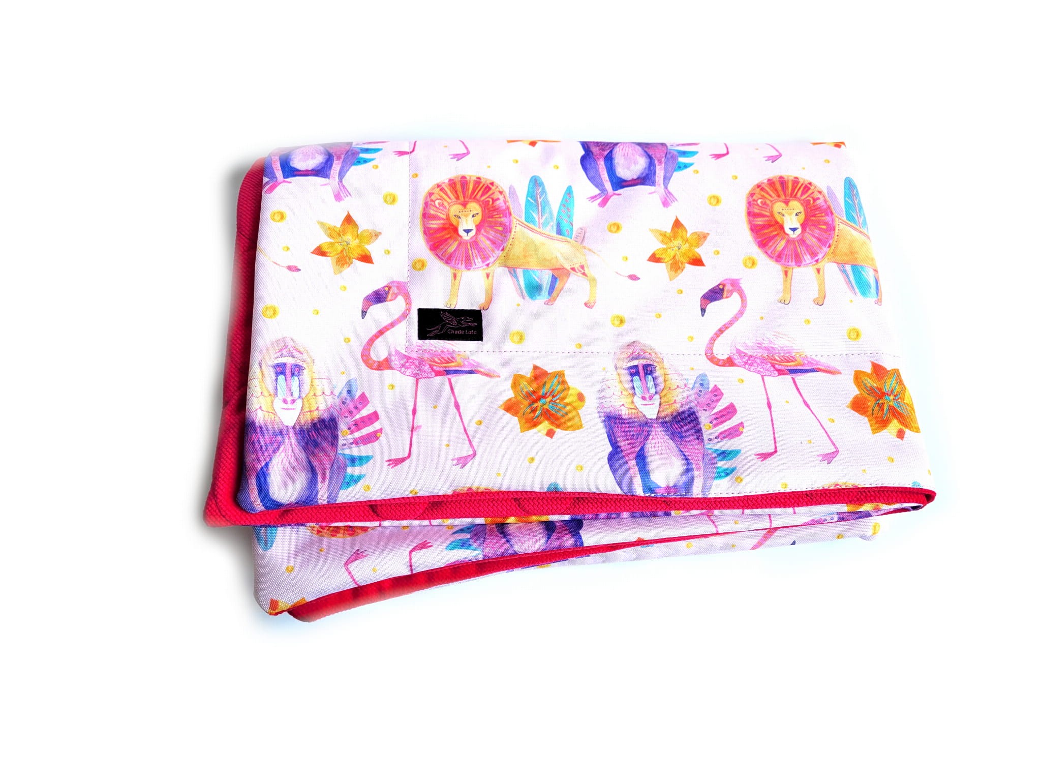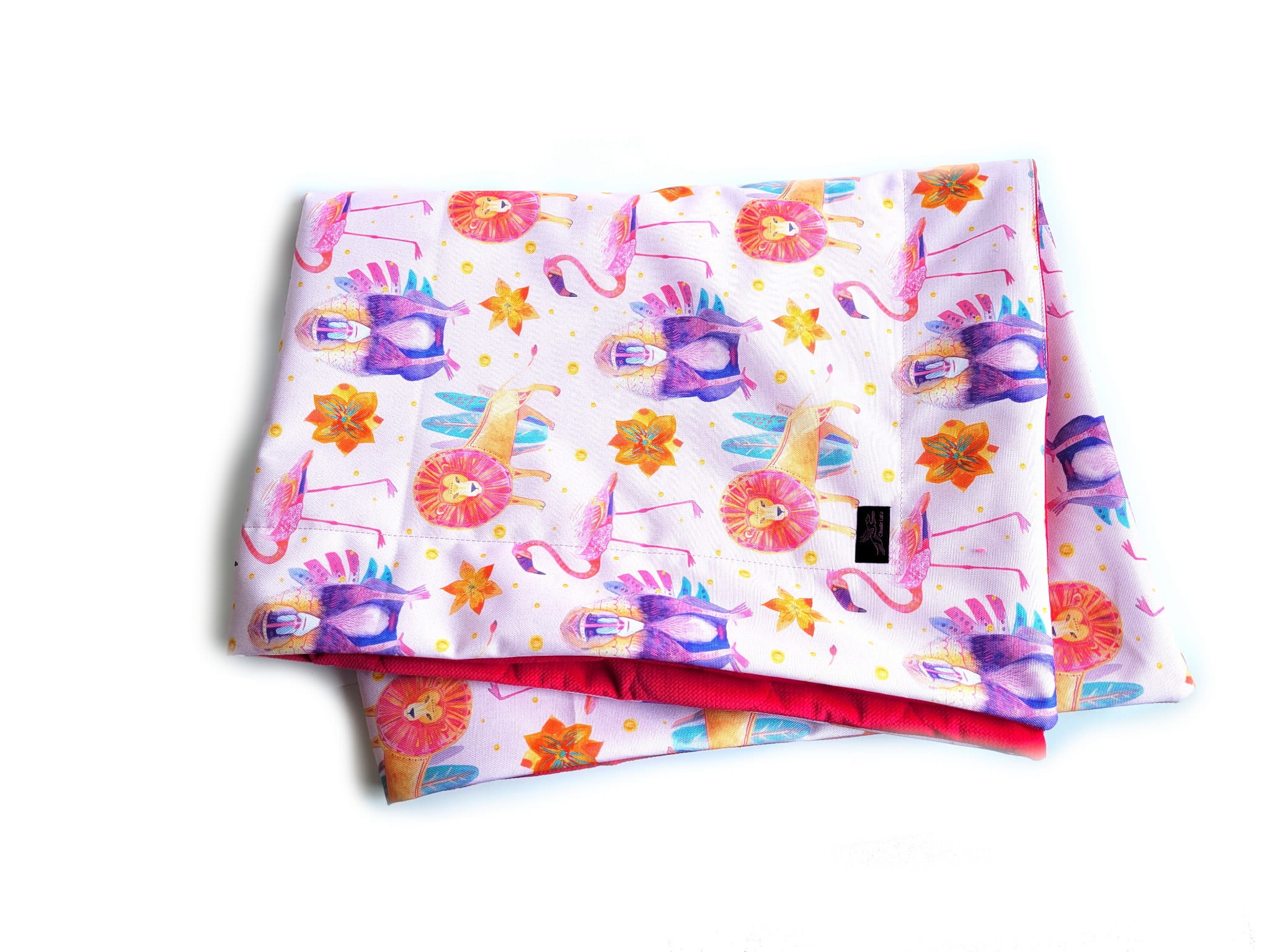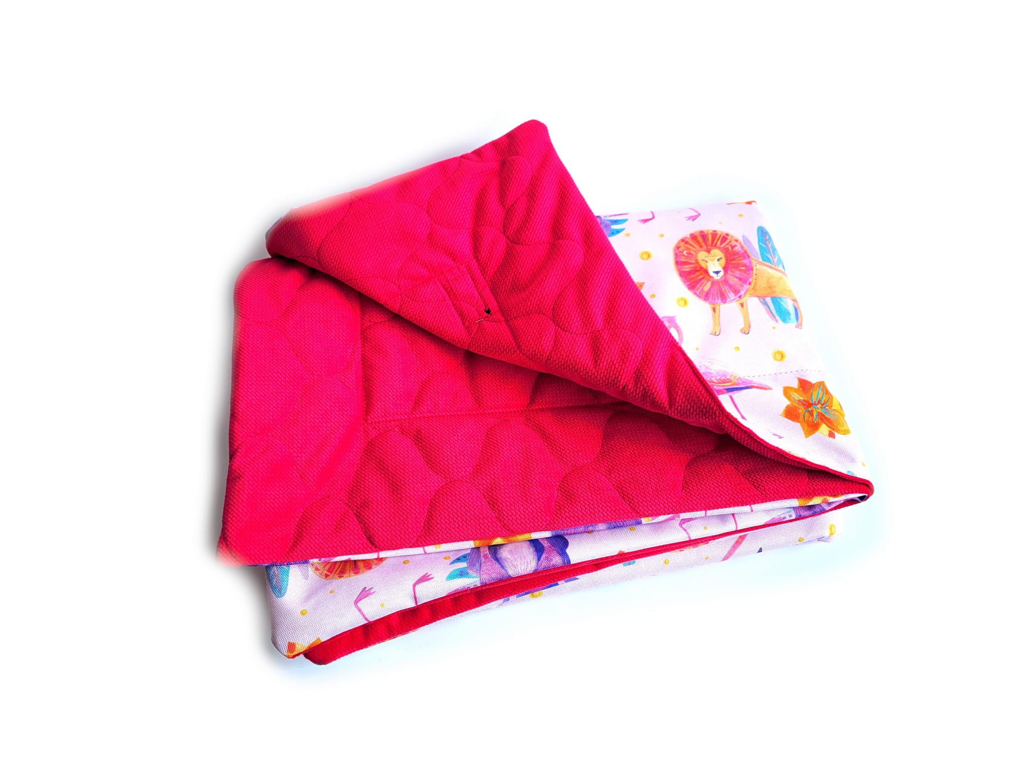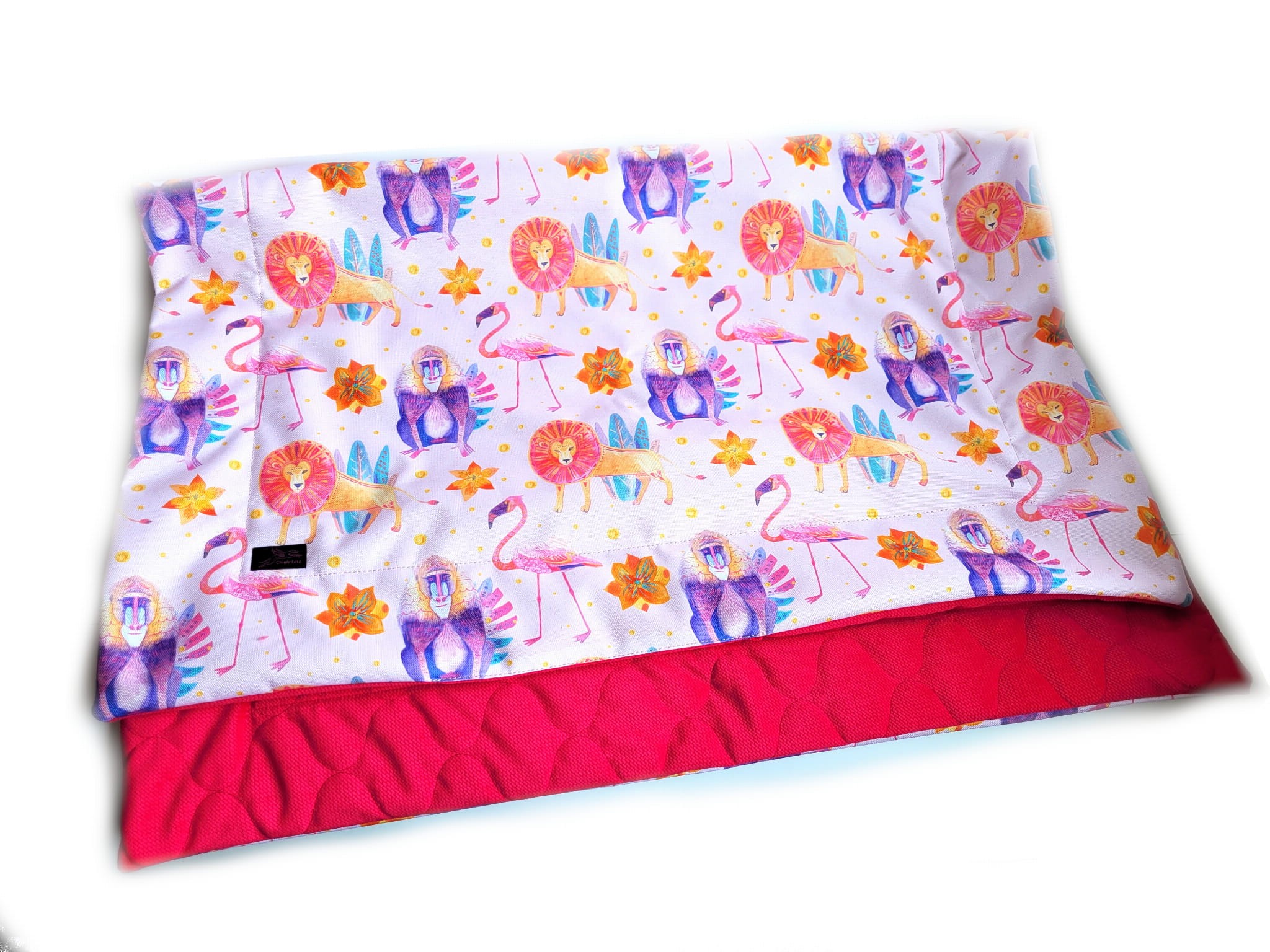 Kocyk wykonany jest z wodoodpornej tkaniny z jednej strony, miękkiego welwetu po drugiej stronie i wypełnione są miękką hypoalergiczną ociepliną.