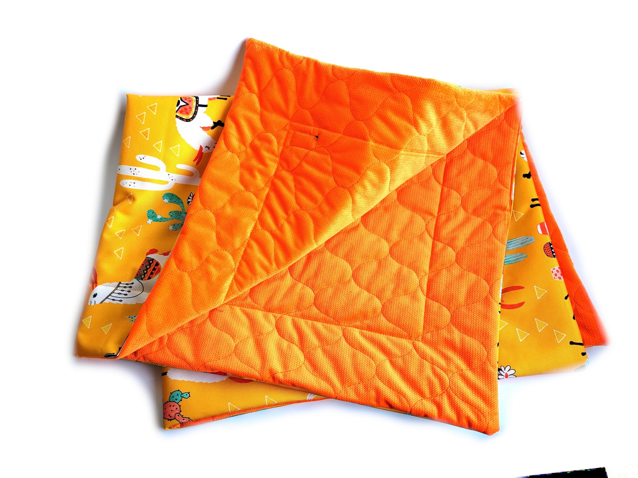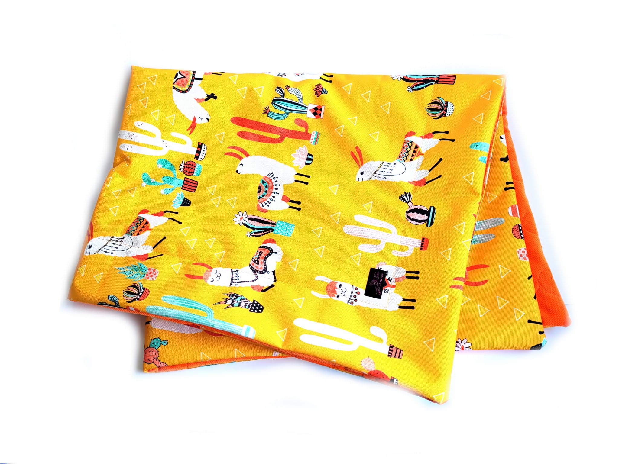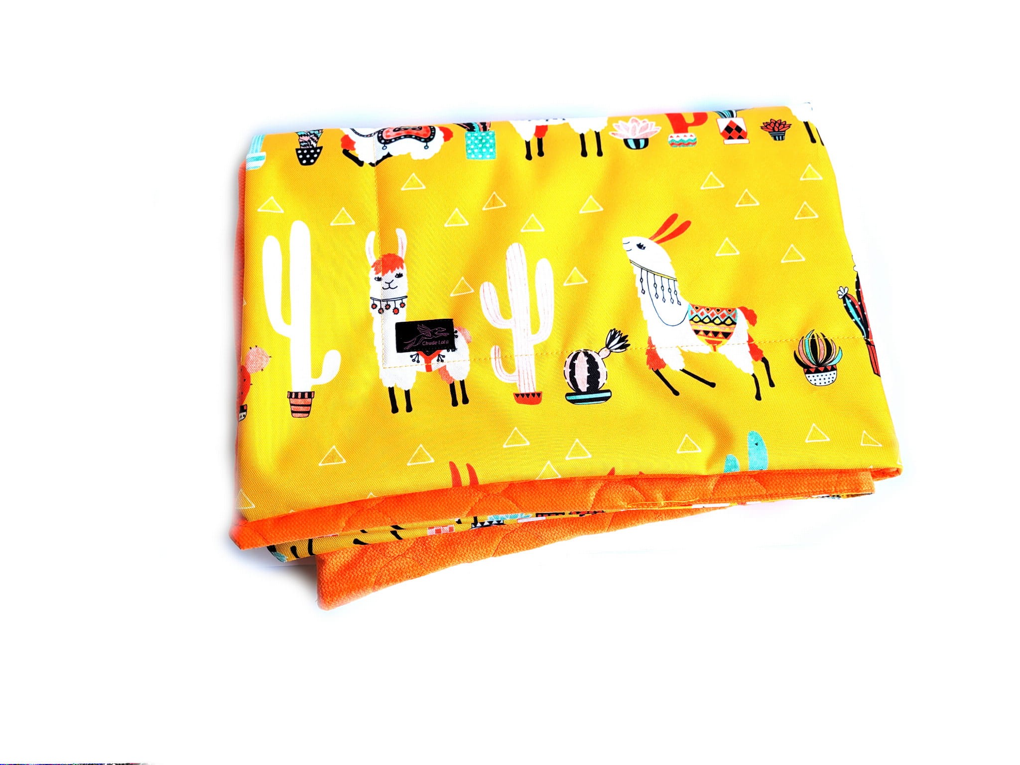 Kocyk wykonany jest z wodoodpornej tkaniny z jednej strony, miękkiego welwetu po drugiej stronie i wypełnione są miękką hypoalergiczną ociepliną.
