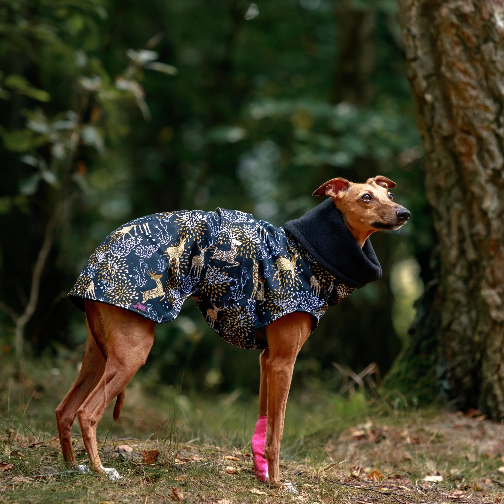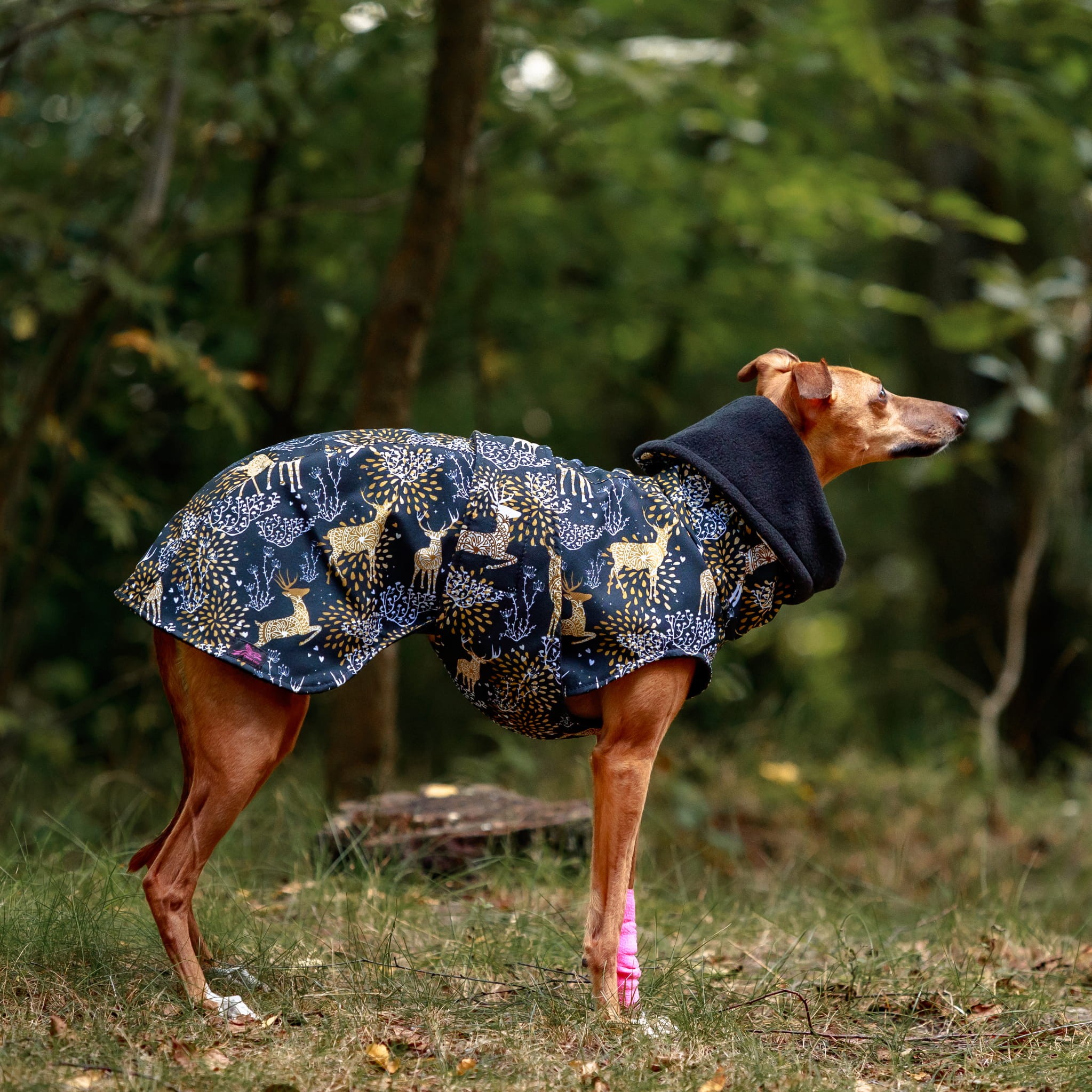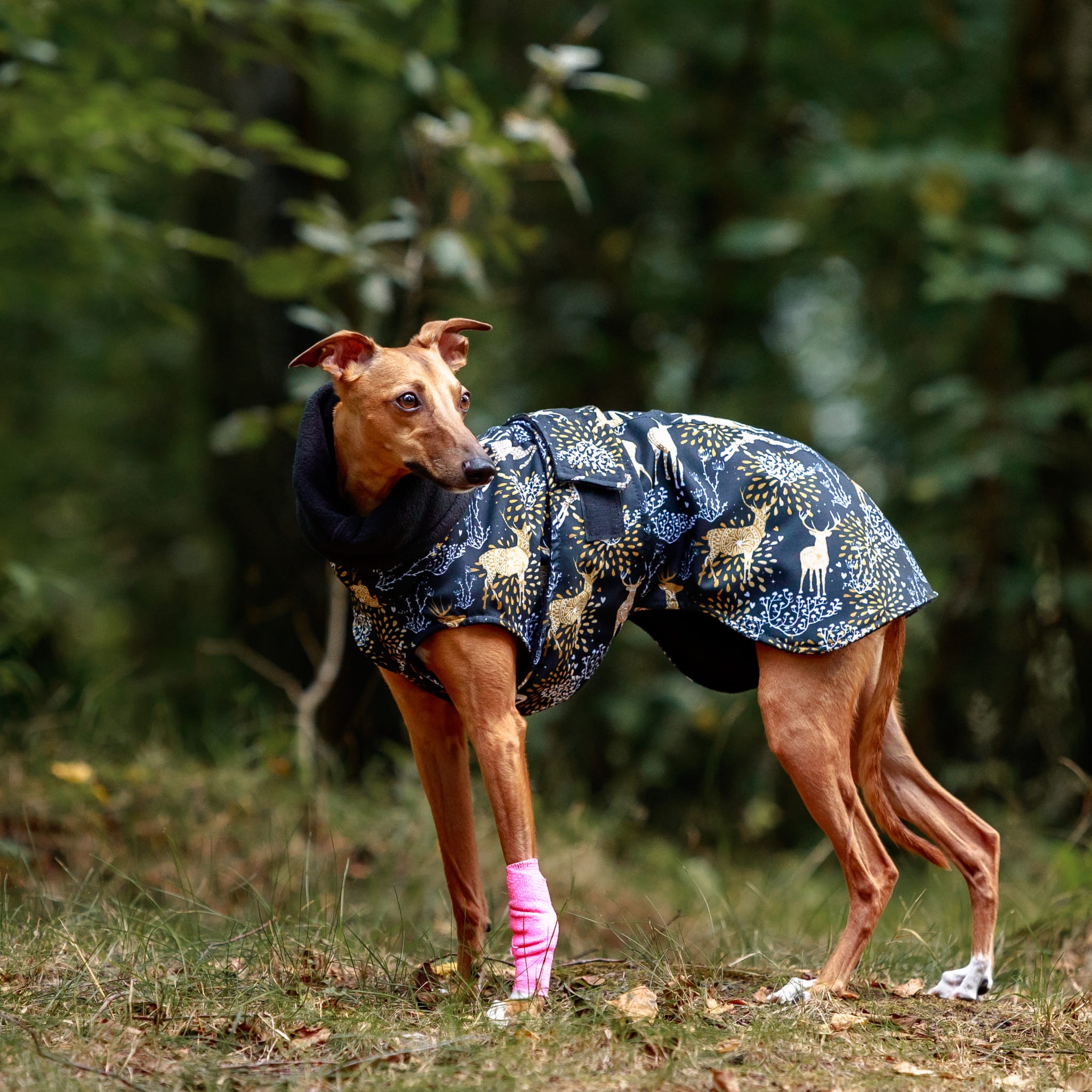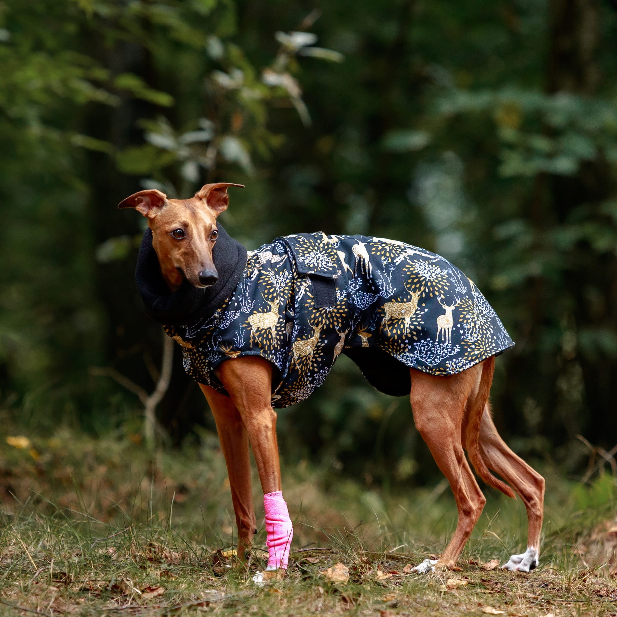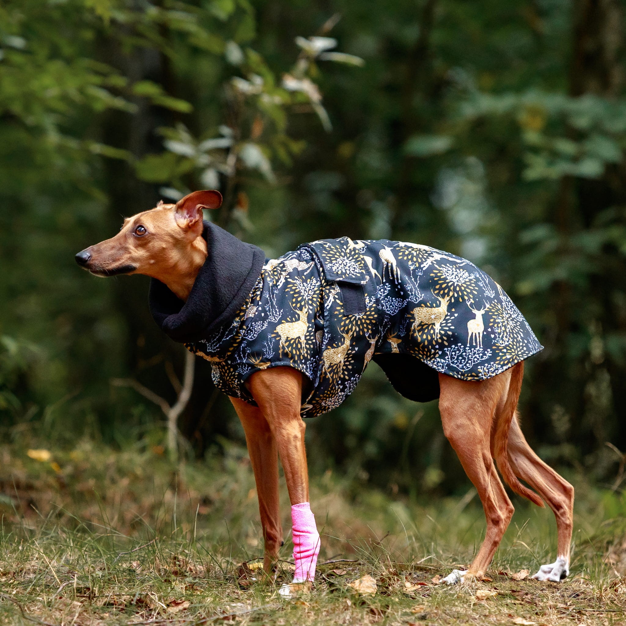 Ocieplana kurtka dla psa idealna na chłodne i wietrzne jesienne i zimowe dni. Wzór złote jelenie, polar czarny.