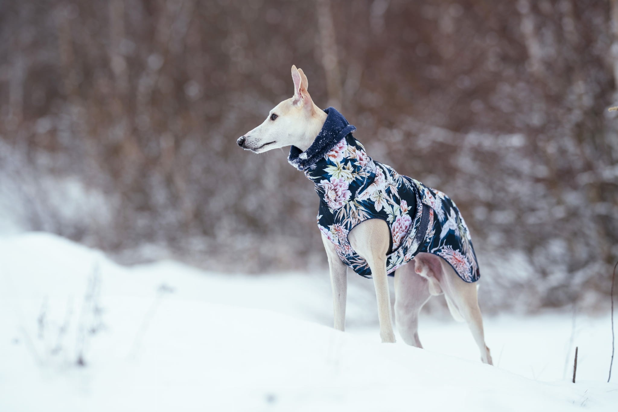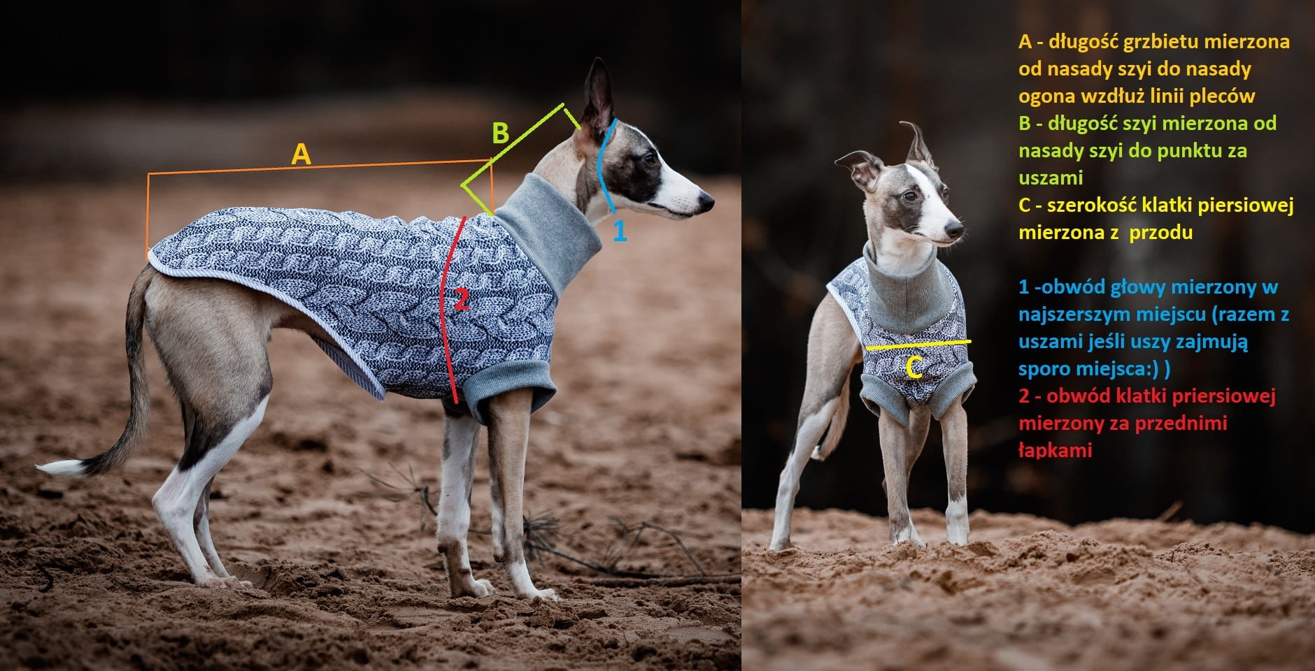 Nasze standardowe rozmiary są przystosowane do wymiarów charcików włoskich, whippetów i większości większych chartów. Jeśli masz psa innej rasy i obawiasz się, że żaden z naszych standardowych rozmiarów nie będzie pasował, skorzystaj z opcji kurtki szytej na miarę.
