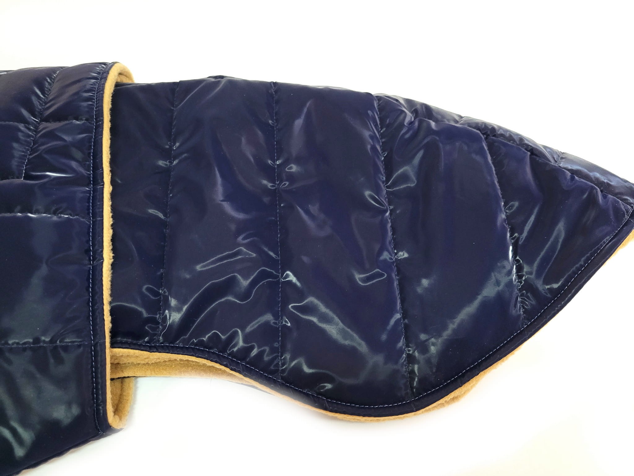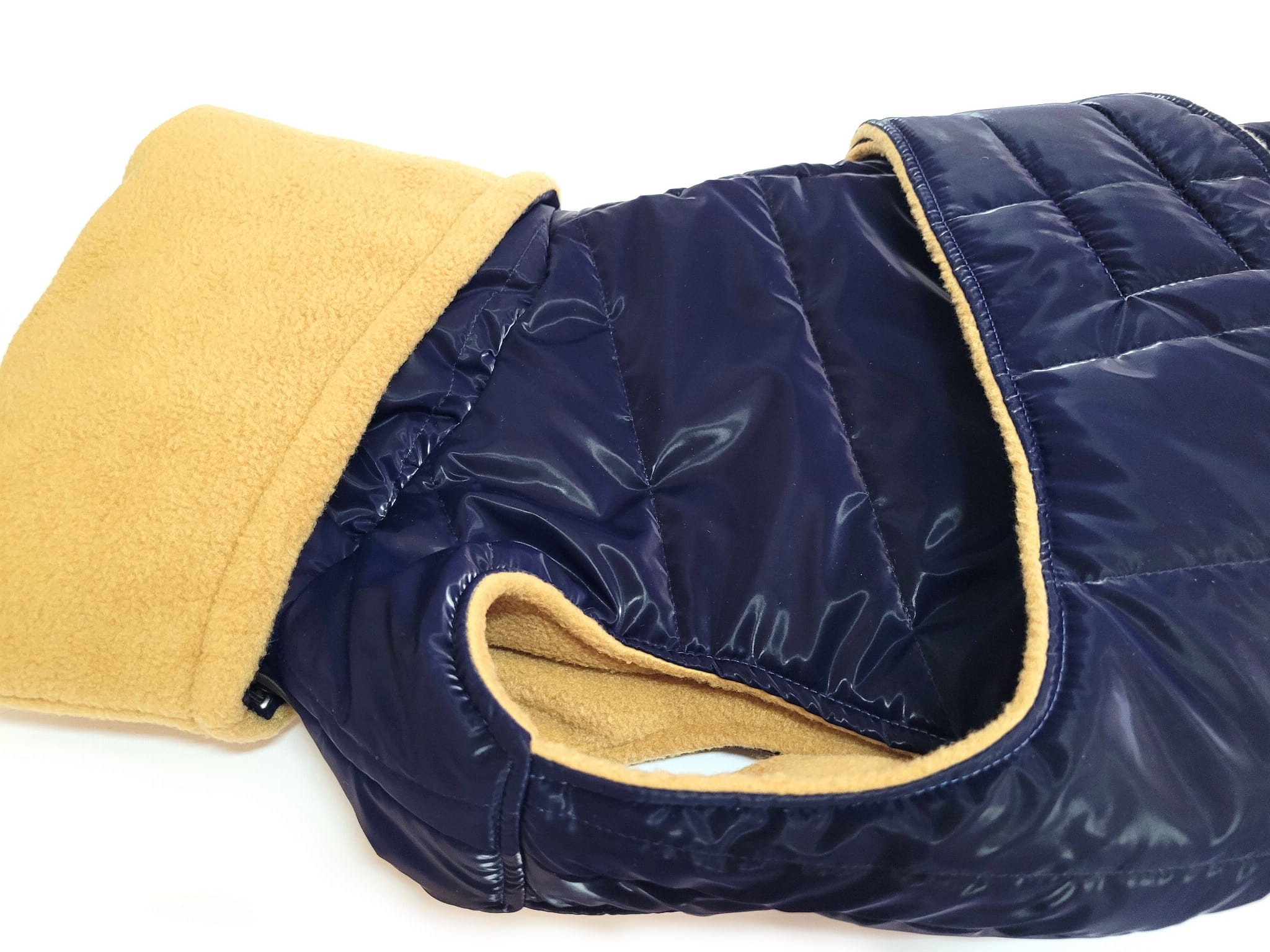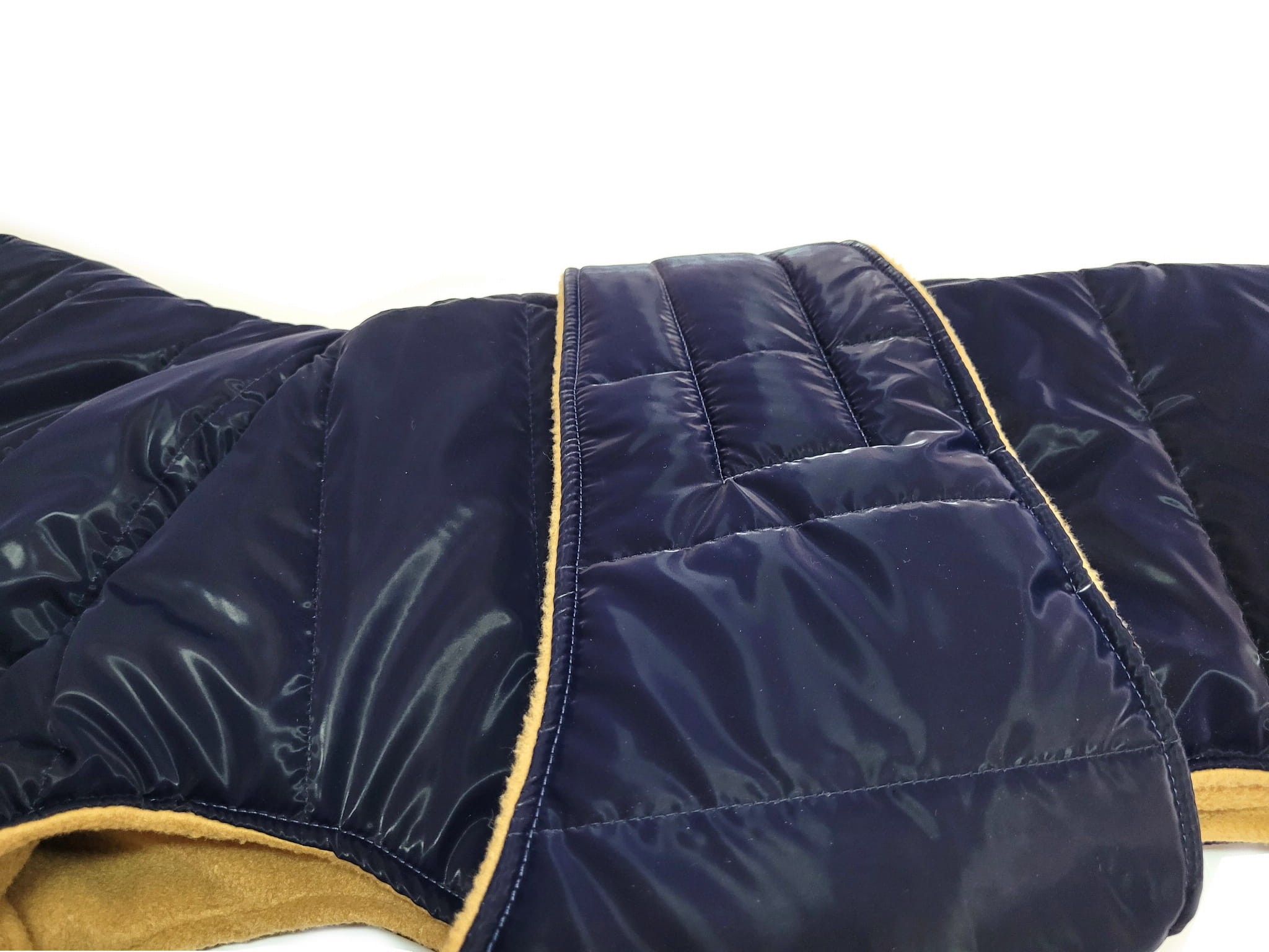 Ocieplana, pikowana kurtka dla psa idealna na chłodne i wietrzne zimowe dni. Kolor srebrny holo, polar czarny.