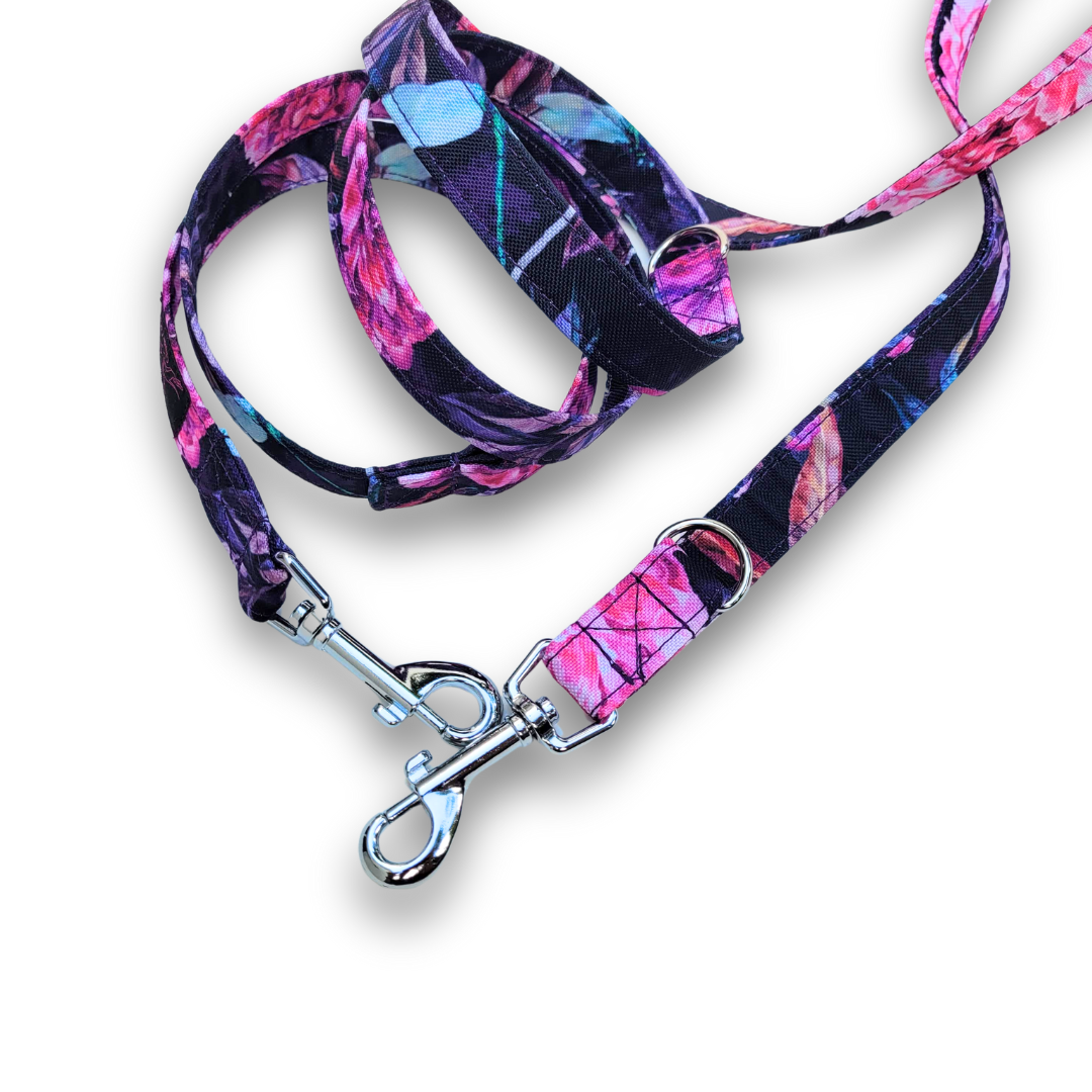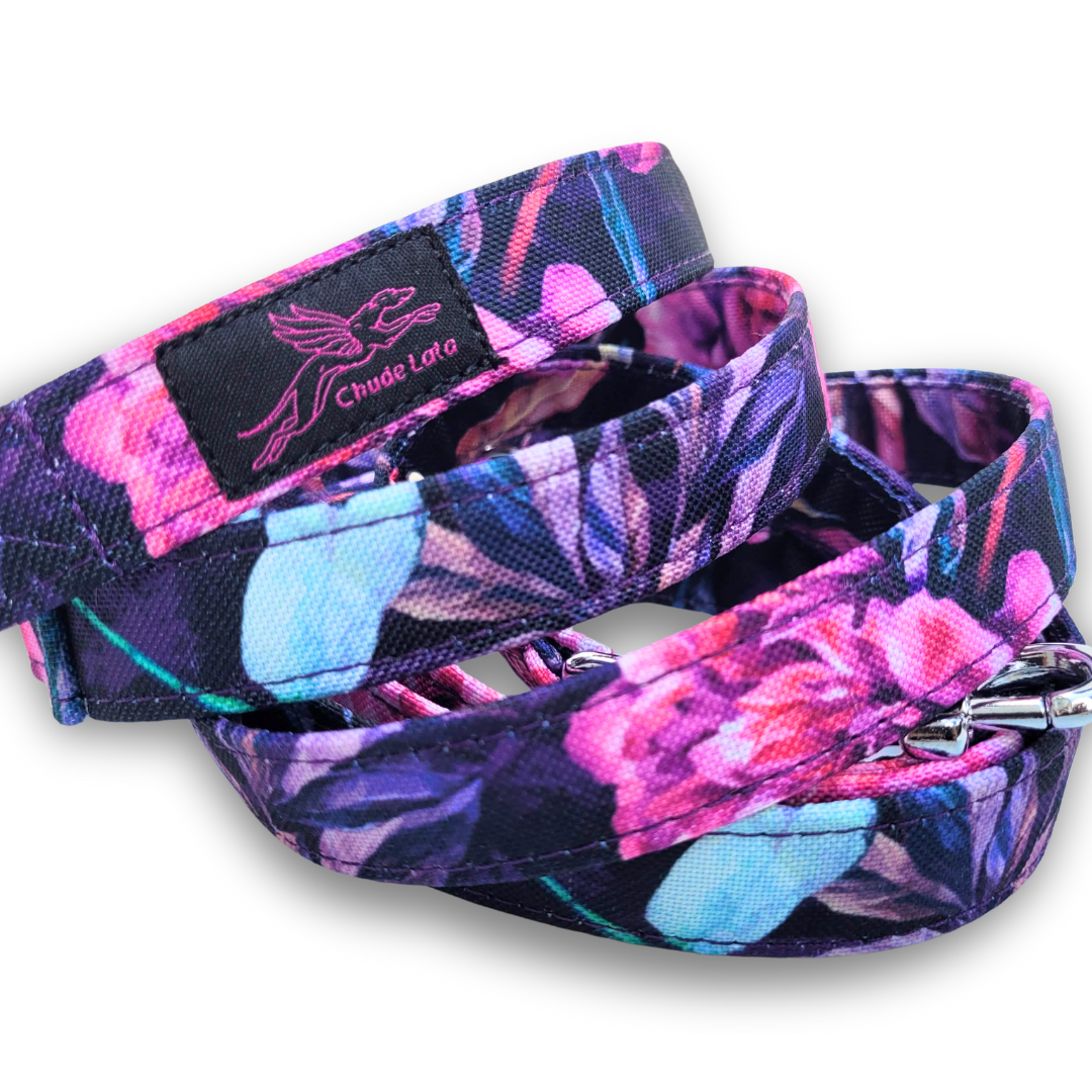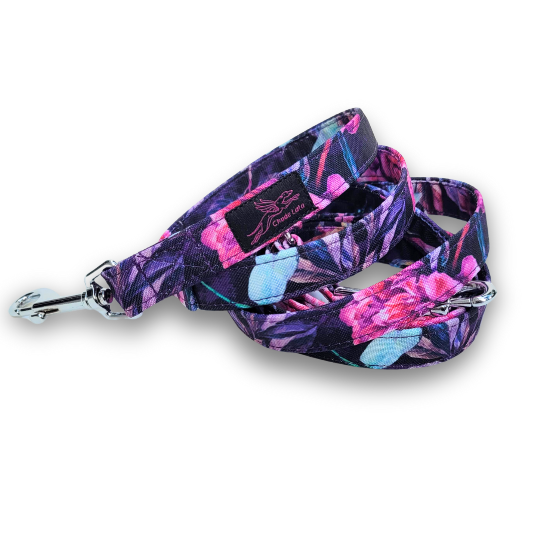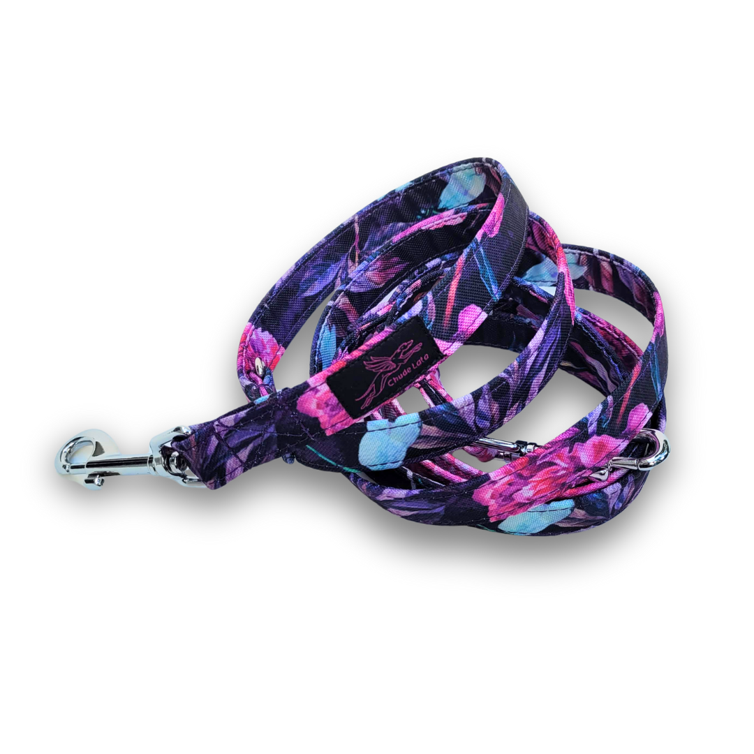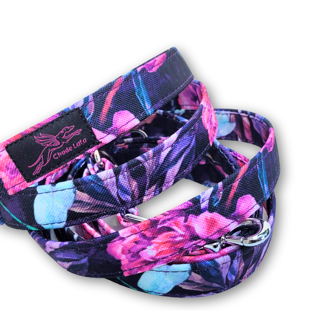 Smycze dla psów szyjemy standardowo w szerokości 2 i 2,5 cm – zwykle dobieramy szerokość taśmy do gabarytów psa.