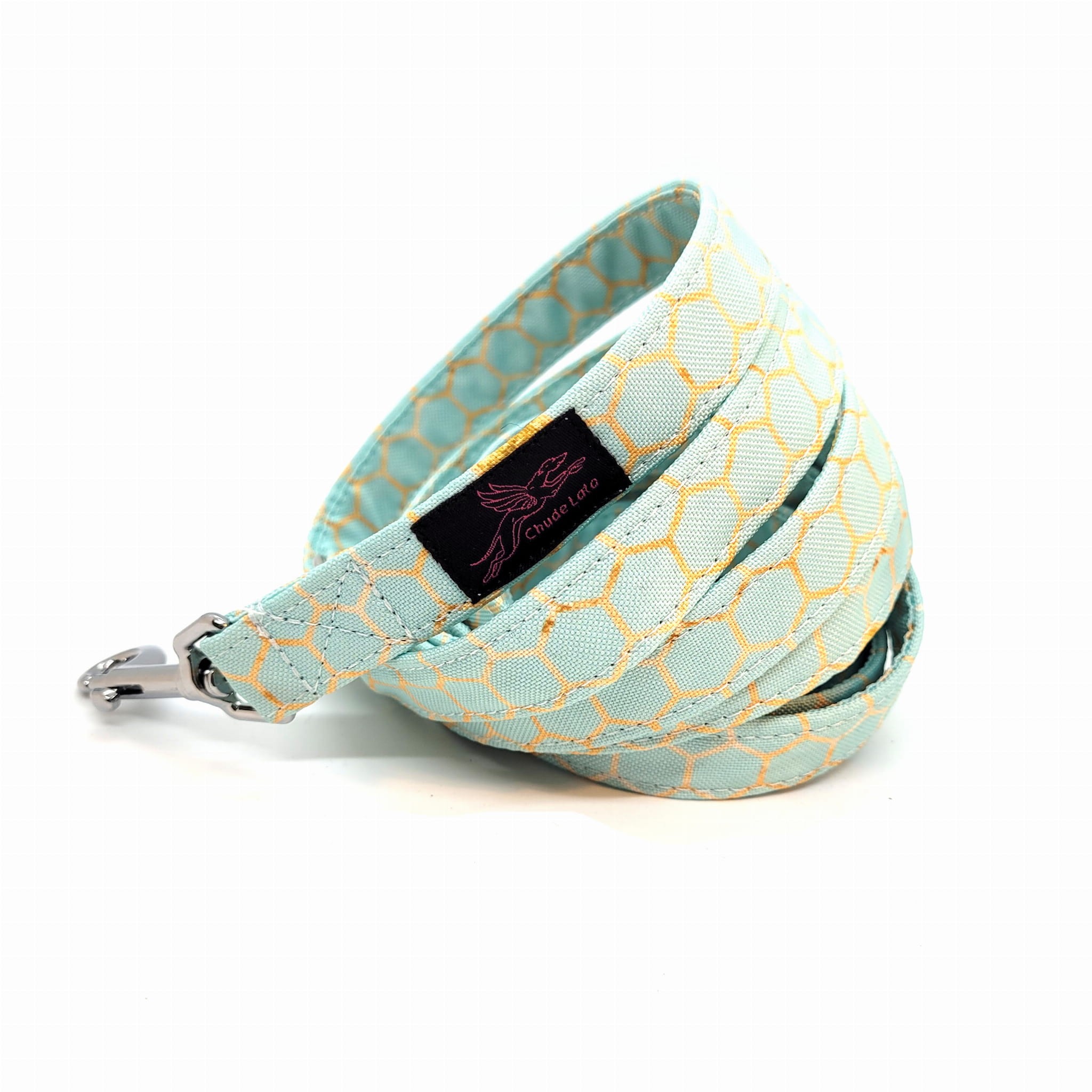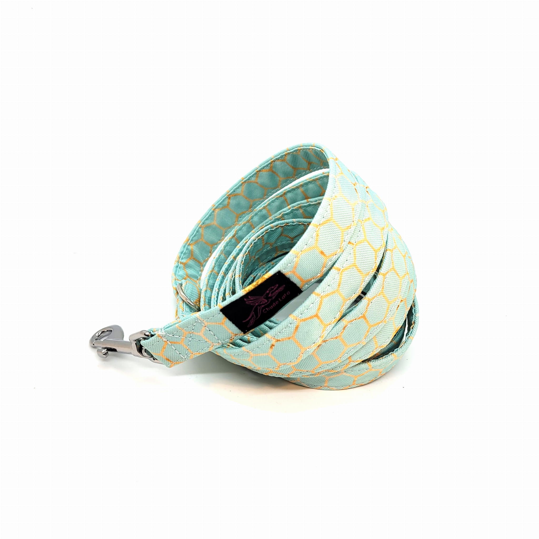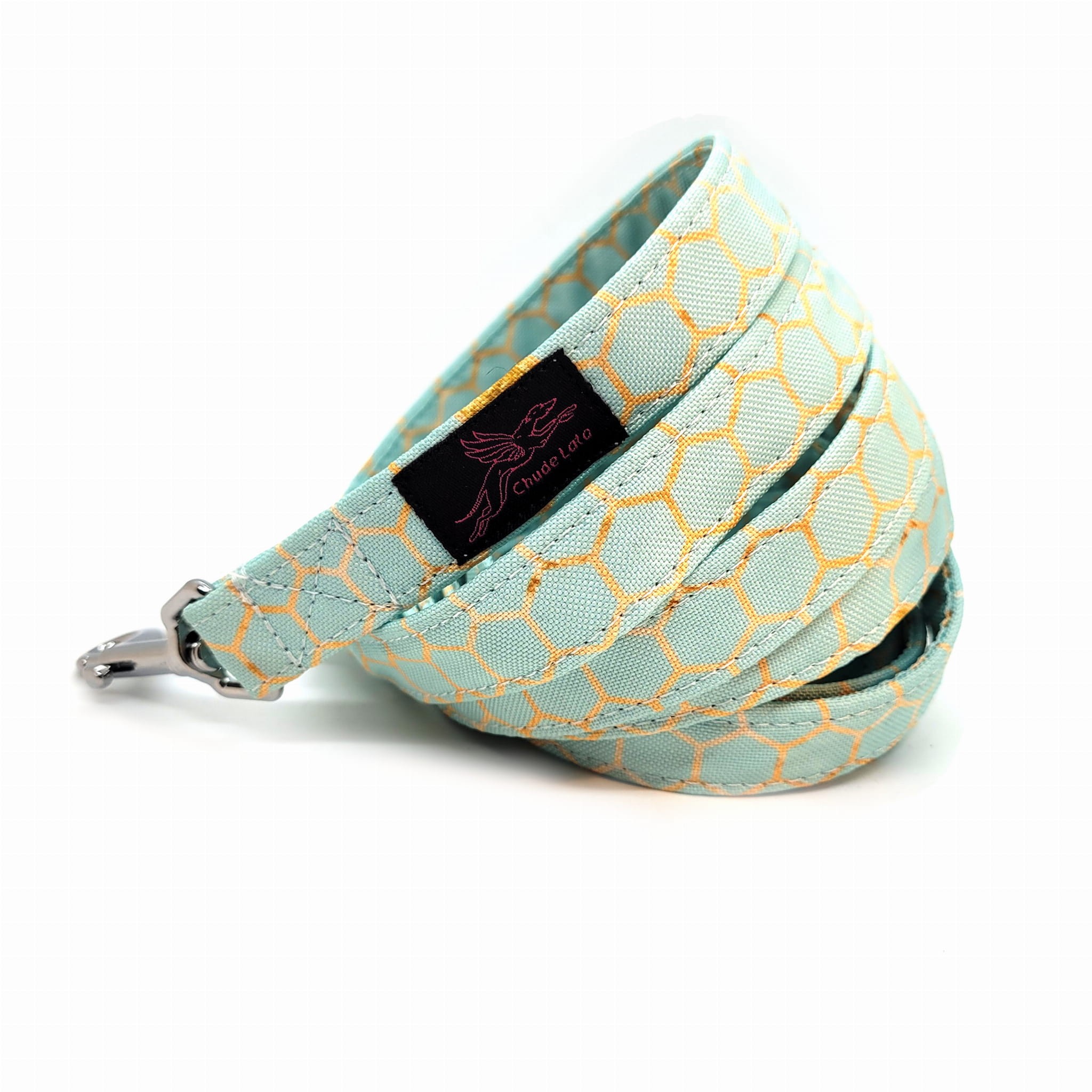 Smycz wykonana jest z wytrzymałej taśmy, obszyta jest kolorową tkaniną wodoodporną. Dzięki temu jest wytrzymała i łatwa w czyszczeniu – wystarczy przetrzeć wilgotną gąbką aby usunąć zabrudzenia ze smyczy.