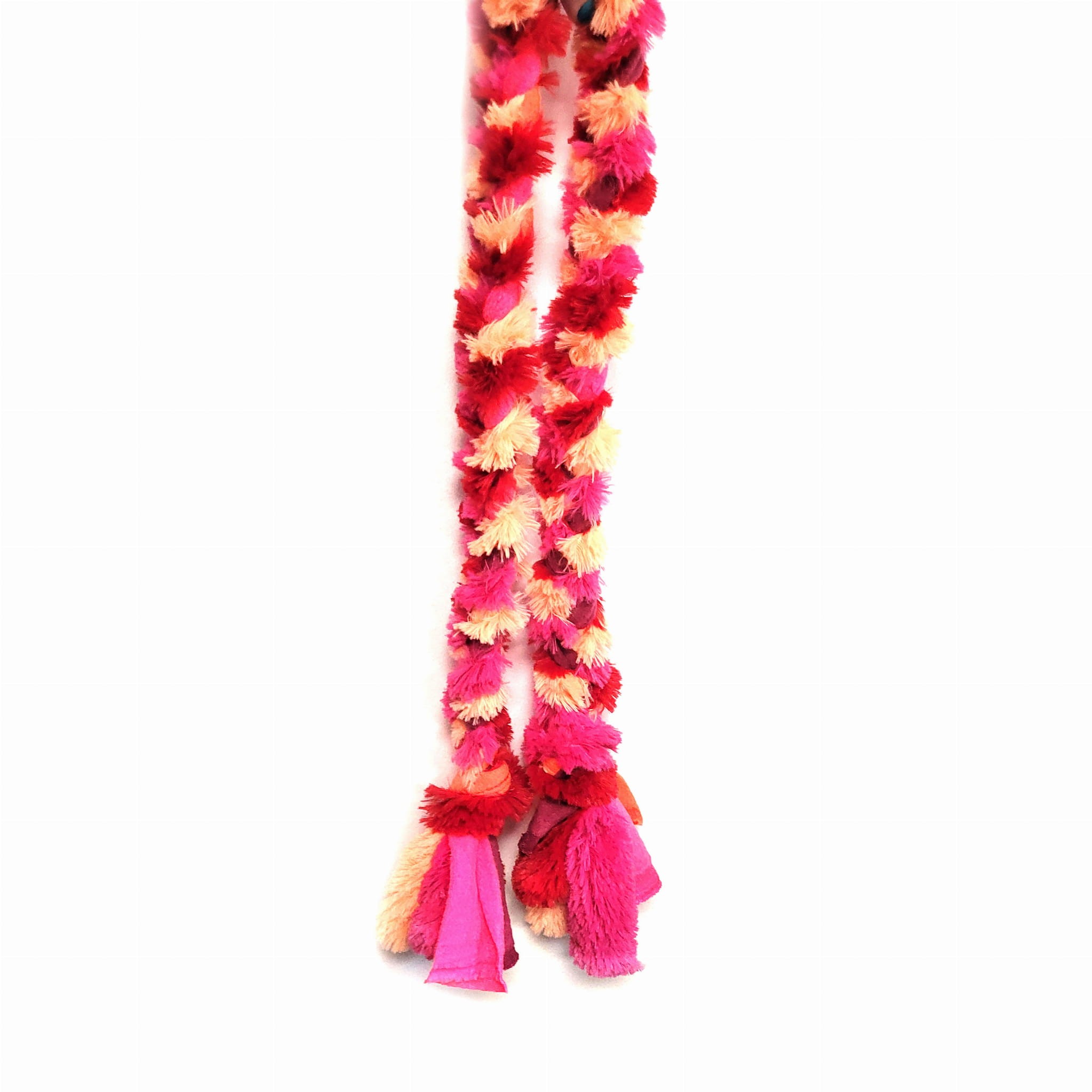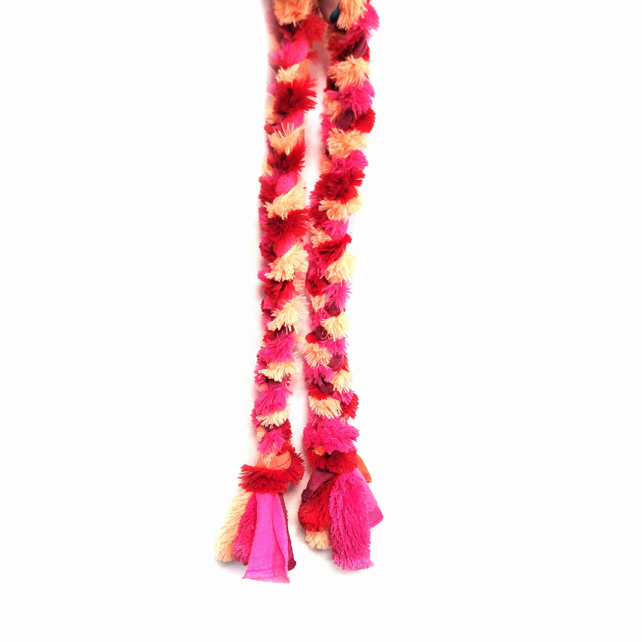 Włochaty szarpak dla psa wykonany jest z polaru oraz z dzianiny futerkowej.