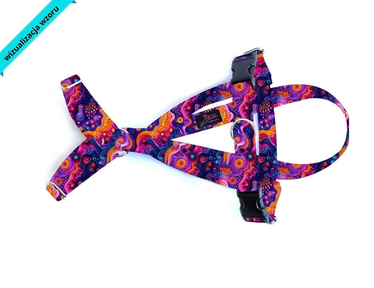 Szelki uszyte są z wytrzymałej taśmy o szerokości 2, 2.5 lub 3 cm (szerokość taśmy dopasowujemy do rozmiaru szelek) obszytej kolorową wodoodporną tkaniną.